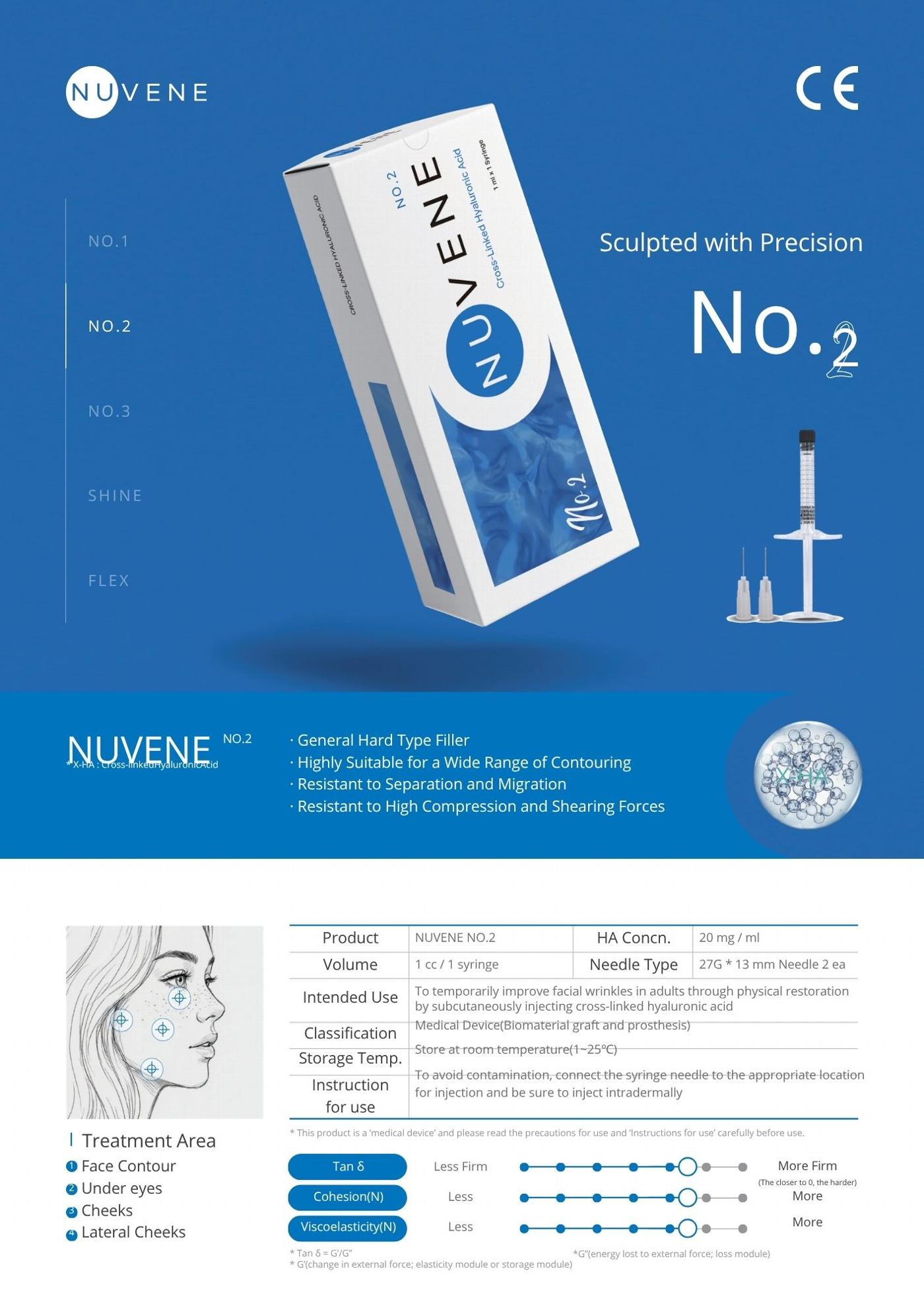NUVENE No2 is a hard type filler, highly suitable for a wide range of countouring. Resistant to separation and migration, high compression and shearing forces.Suitable for face contouring, cheeks, lateral cheeks and under eye area.